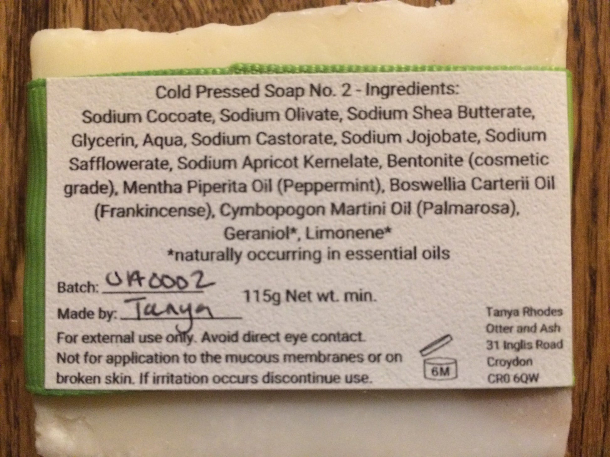 Willow Wish Peppermint and Fullers Earth soap contains coconut oil (30%), olive oil (30%), shea butter (20%), castor oil, safflower oil, apricot kernel oil, jojoba oil, argan oil, peppermint essential oil, frankincense essential oil, palmarosa essential oil, and benonite (fullers earth).