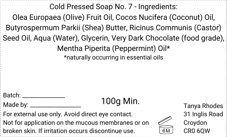 Willow Wish Orange Chocolate soap contains coconut oil (30%), olive oil (30%), shea butter (20%), castor oil, very dark chocolate and peppermint essential oil.